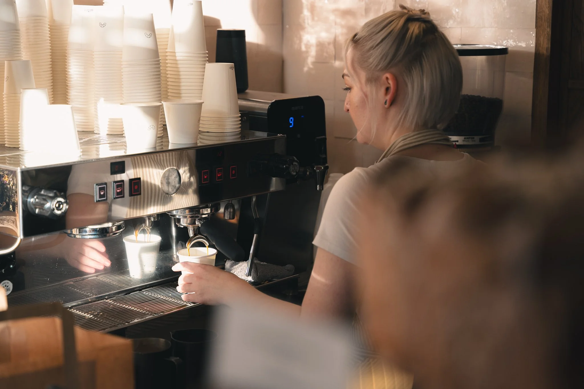 A woman operating an espresso machine in a coffee shop, preparing coffee for a customer.