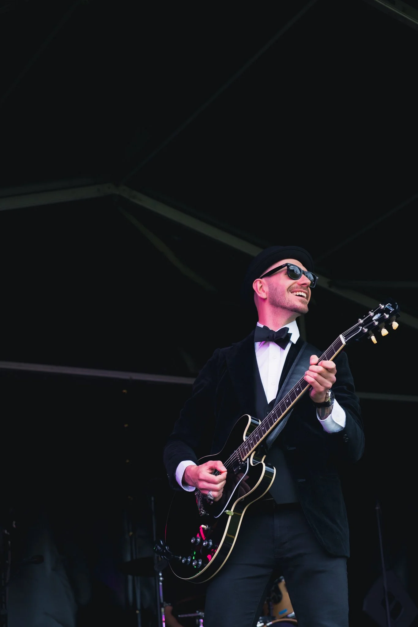 Man in black jacket, white shirt, black bow tie, sunglasses, and a black hat playing an electric guitar on stage during a performance.
