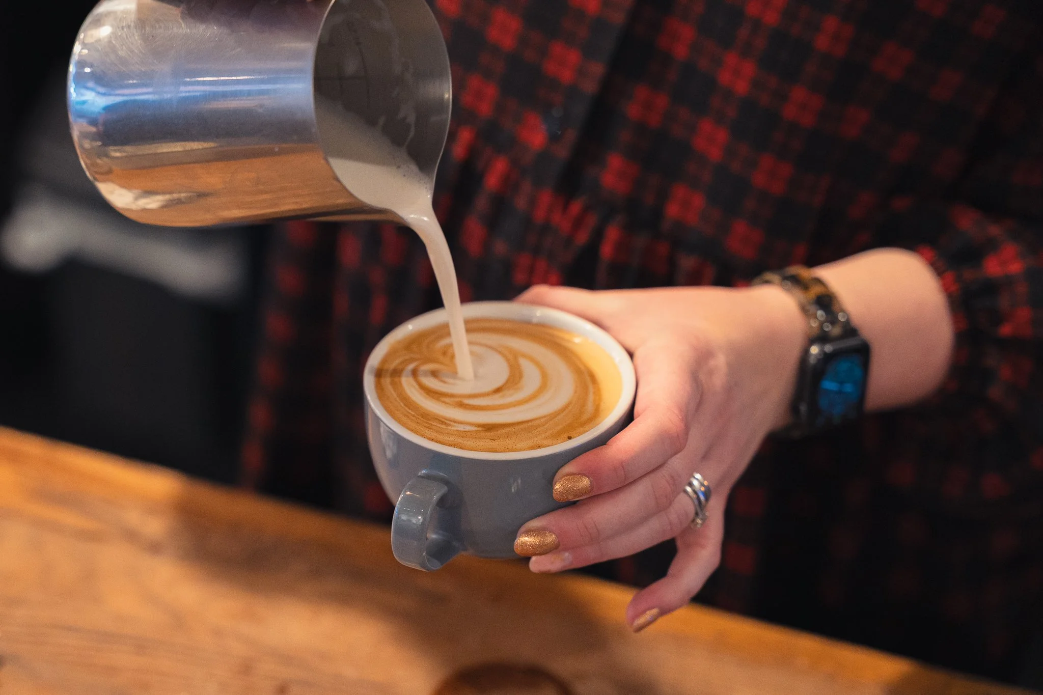 Person pouring steamed milk into a cup of coffee, creating latte art with a swirling pattern. View fullsize