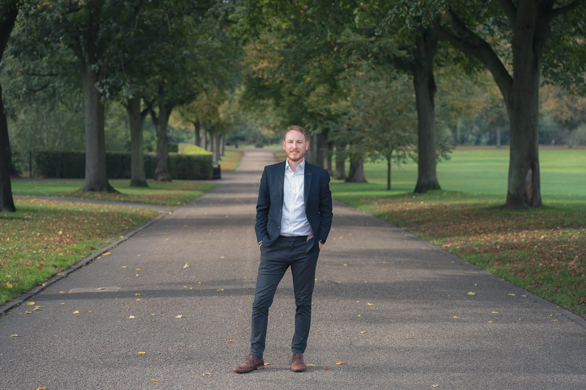 A man in a suit standing on a tree-lined pathway in a park with greenery and trees.