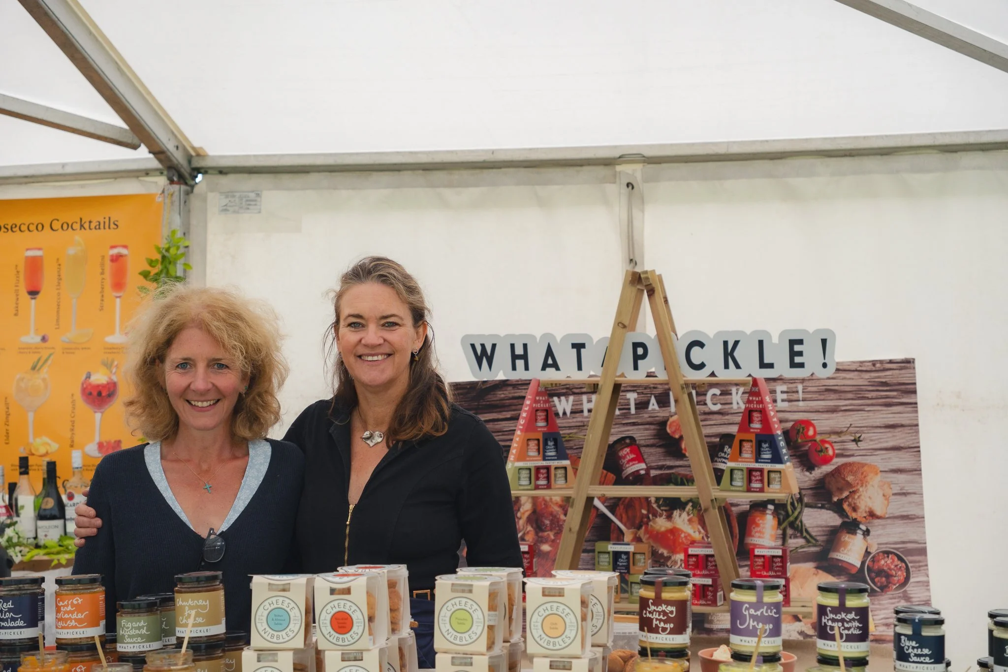 Two smiling women standing behind a table with cheese and sauces at a market stall with a sign that says "What P-ckle!" in the background. View fullsize